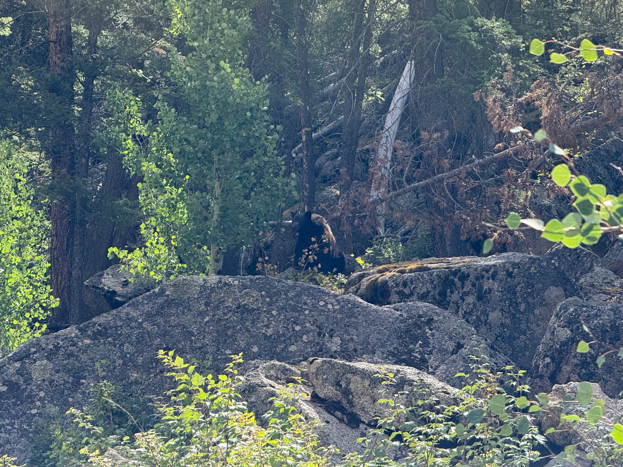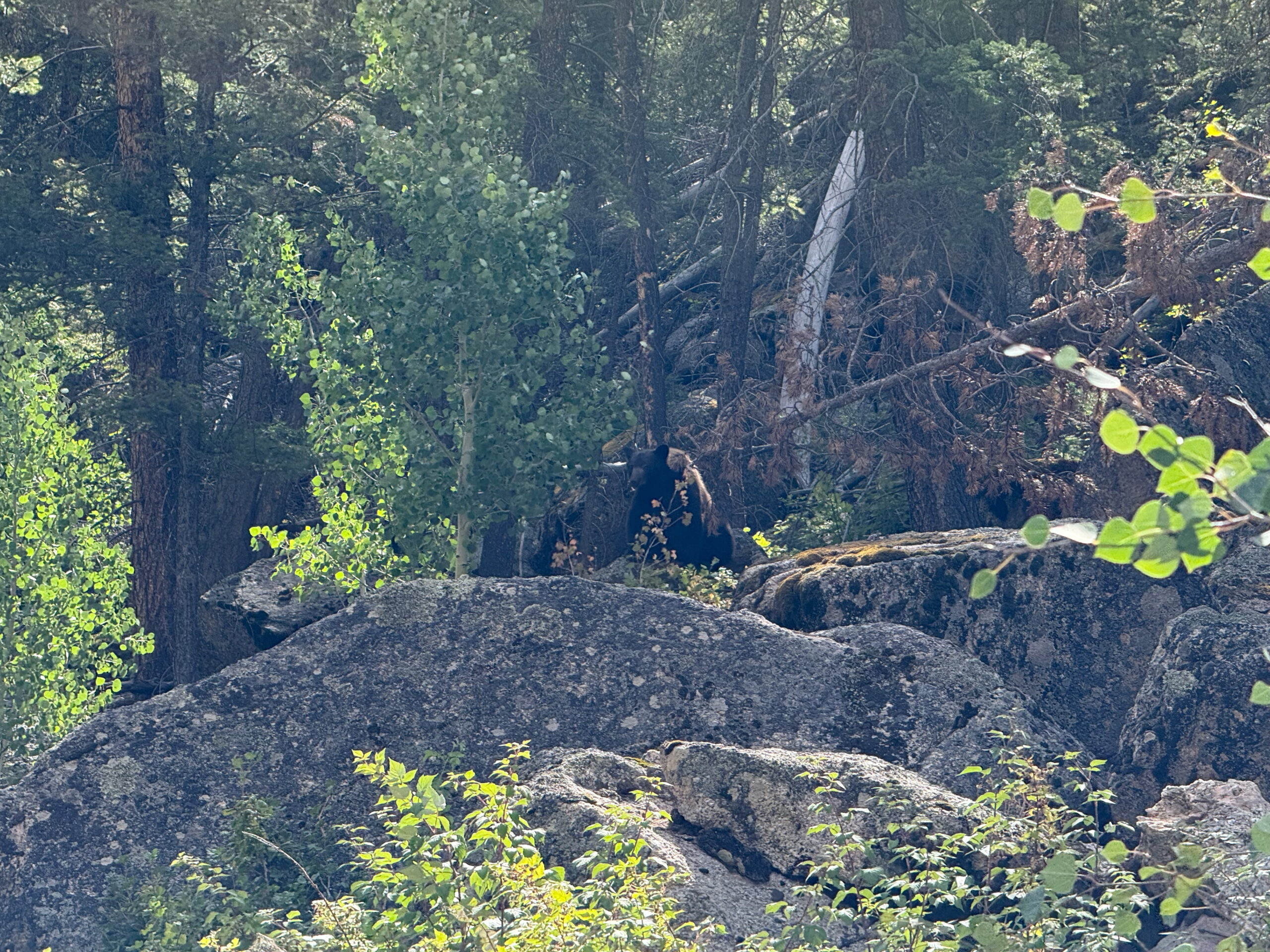 On the ride through the forest towards the pass, I noticed some movement on the road, and quickly recognised it as a black bear. I slowed quickly to a halt, and the bear looked at me for a second before quickly climbing up the steep bank to my right. It climbed about 15 meters or so, then stopped to watch me watching it. We watched in silence for a minute or so, then I said my farewells and continued on my way.