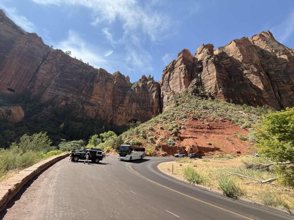 Several miles of beautiful geology and I reached a queue of cars. There is only 1 road through the park, so you are sharing it with every other visitor. The queue turned into a 15 minute wait, though while i was waiting, I was not sure what I was waiting for as I could only see about 10 or 15 cars ahead of me, behind a tour bus, and then a corner which was obscured by a large boulder preventing further assessment of the road and queue.