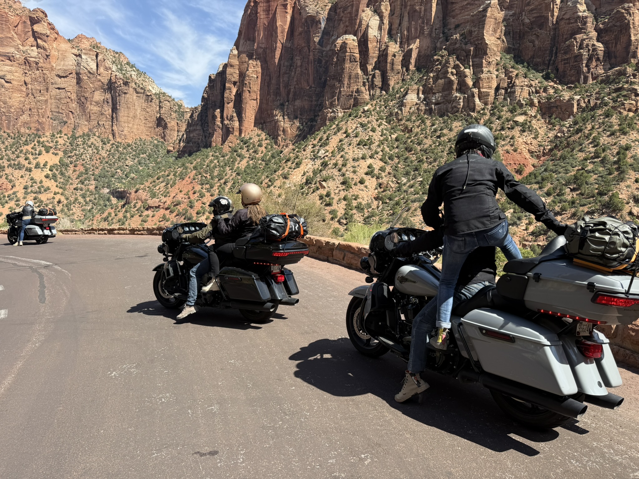 Exiting the tunnel, the views are incredible. A high canyon, closed on 3 sides, opens up to the right, with a set of hairpin bends awaiting a descent to the floor of the canyon. I rode to the first vista point, and snapped a few pictures. 3 large touring Harley Davidsons pulled up, and 3 French couples stopped for the same views I was observing. They had hired the bikes in LA, and were doing agrand tour – and one of them took a few pictures of me with the bike and the canyon in the background.