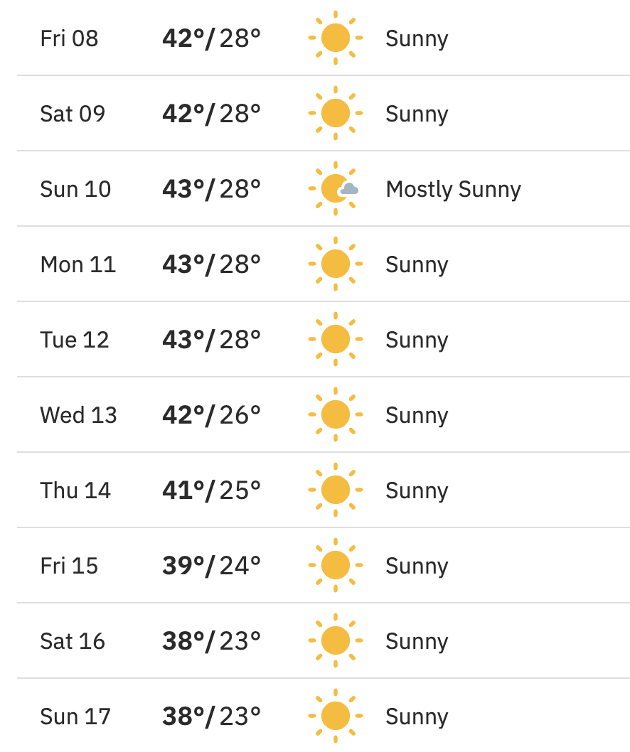 It is the off season in Las Vegas, and for very good reason. The forecast for next week is horrendous. For those of you who operate in Fahrenheit, look away now – but for those of you who have a proper education, here is next weeks forecast for Las Vegas:
